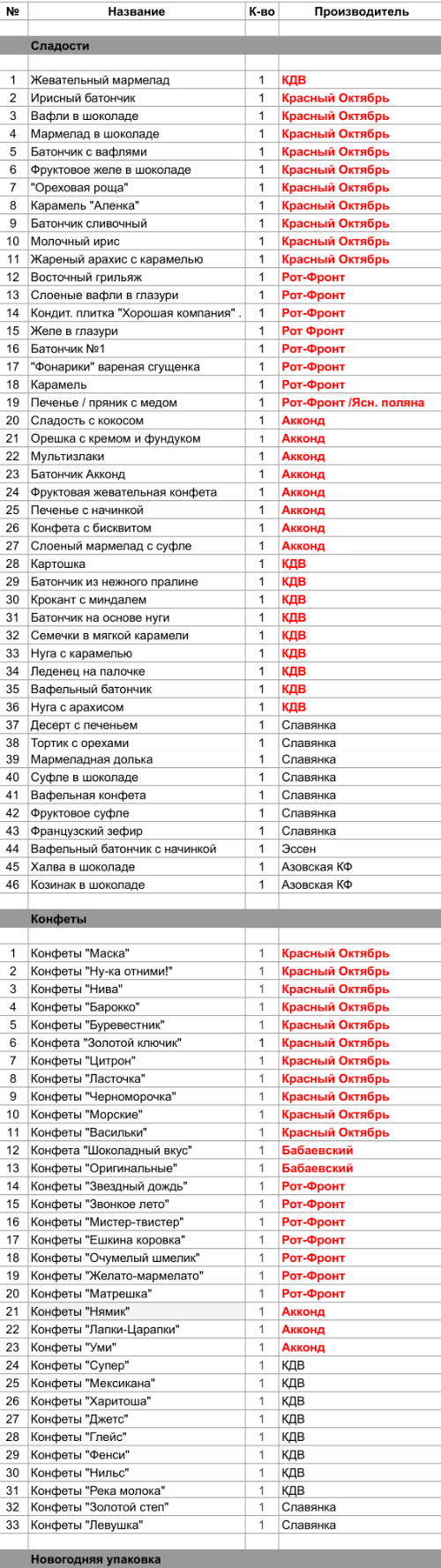 Ирисный батончик (1 шт), Вафли в шоколаде (1 шт), Мармелад в шоколаде (1 шт), Батончик с вафлями (1 шт), Фруктовое желе в шоколаде (1 шт), "Ореховая роща" (1 шт), Карамель "Аленка" (1 шт), Батончик сливочный  (1 шт), Молочный ирис (1 шт), Жареный арахис с карамелью (1 шт), Конфеты "Маска" (1 шт), Конфеты "Ну-ка отними!" (1 шт), Конфеты "Нива" (1 шт), Конфеты "Барокко" (1 шт), Конфеты "Буревестник" (1 шт), Конфета "Золотой ключик" (1 шт), Конфеты "Цитрон" (1 шт), Конфеты "Ласточка" (1 шт), Конфеты "Черноморочка" (1 шт), Конфеты "Морские" (1 шт), Конфеты "Васильки" (1 шт)