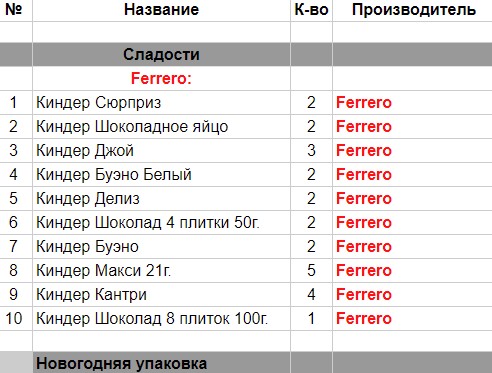 Киндер Сюрприз (3 шт), Киндер Джой (3 шт), Киндер Бонс (3 шт), Киндер Делис (2 шт), Киндер Шоколад 4 плитки 50 г. (3 шт), Киндер Буэно (2 шт), Киндер Макси 21 г. (5 шт), Киндер Кантри (со злаками) (3 шт)